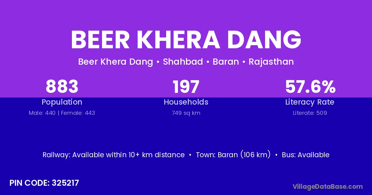 Baran (106 km) is the nearest town to Beer Khera Dang village for major economic activities and is located approximately 106 km away.