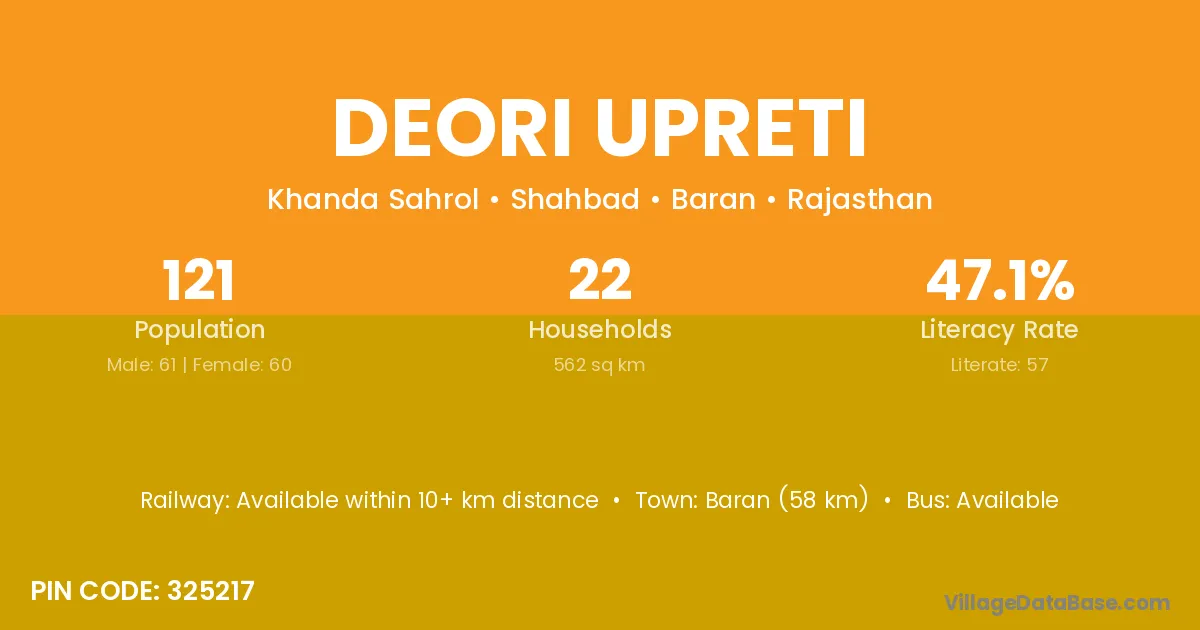 Deori Upreti village has a total population of 121 people, of which 61 are males and 60 are females.