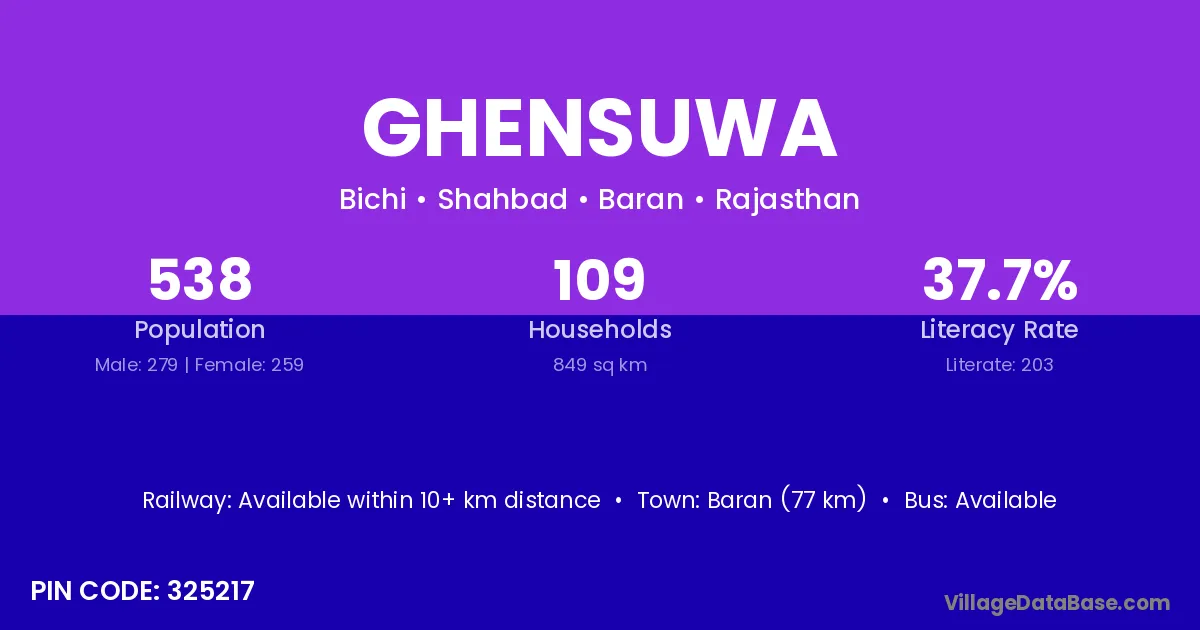 Baran (77 km) is the nearest town to Ghensuwa village for major economic activities and is located approximately 77 km away.