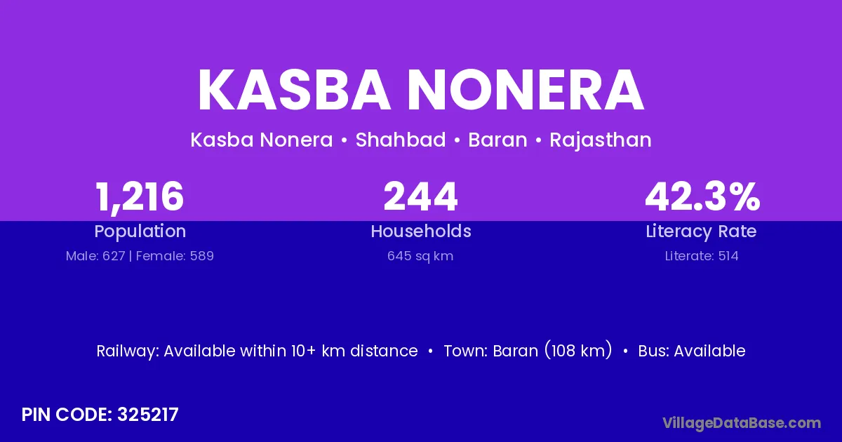 Baran (108 km) is the nearest town to Kasba Nonera village for major economic activities and is located approximately 108 km away.