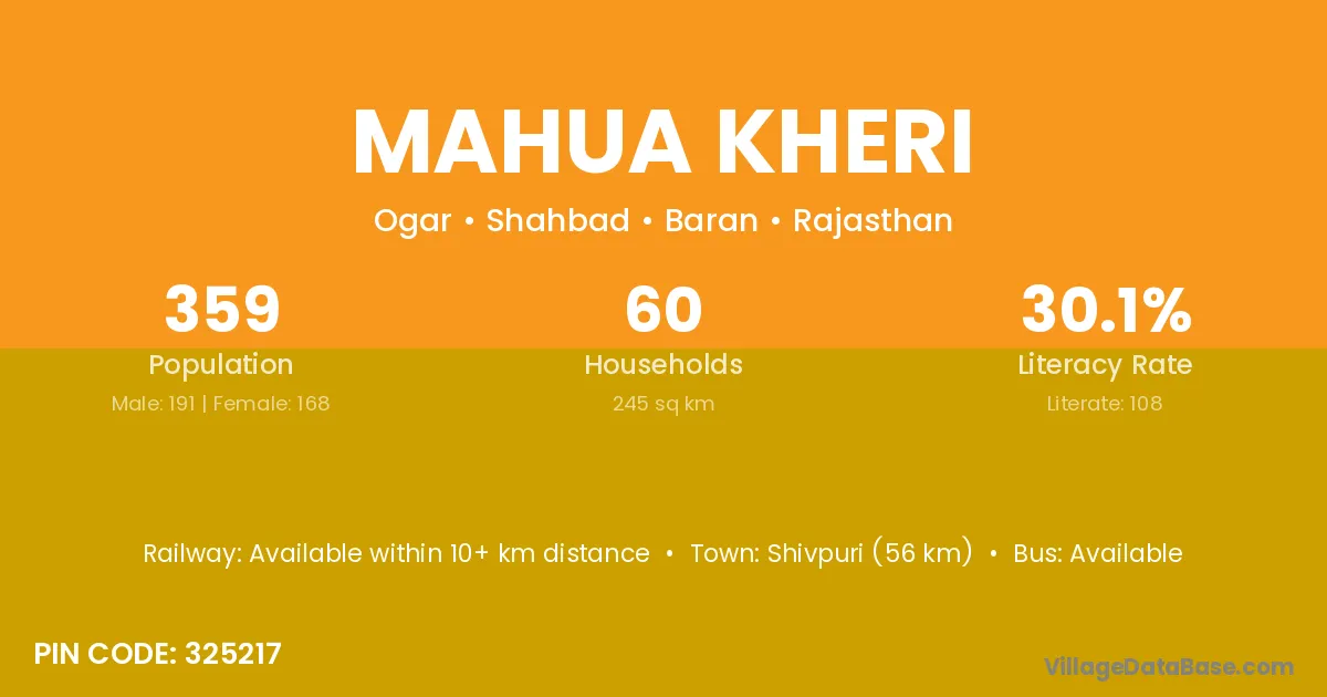 Shivpuri (56 km) is the nearest town to Mahua Kheri village for major economic activities and is located approximately 56 km away.