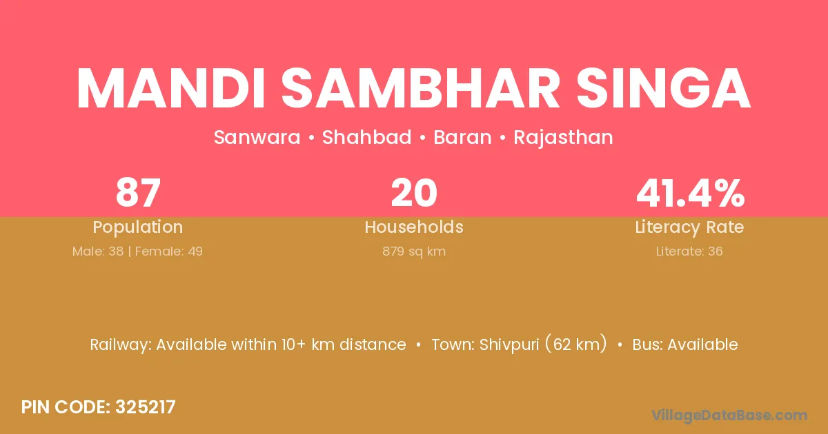 Mandi Sambhar Singa village has a total population of 87 people, of which 38 are males and 49 are females.