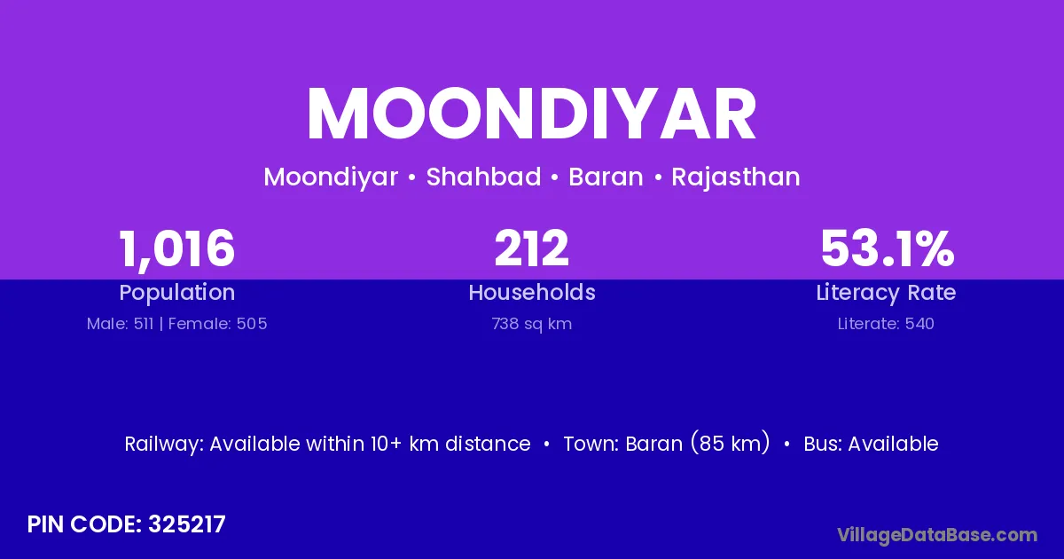 Baran (85 km) is the nearest town to Moondiyar village for major economic activities and is located approximately 85 km away.