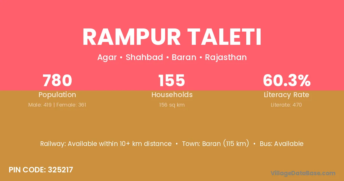 Baran (115 km) is the nearest town to Rampur Taleti village for major economic activities and is located approximately 115 km away.