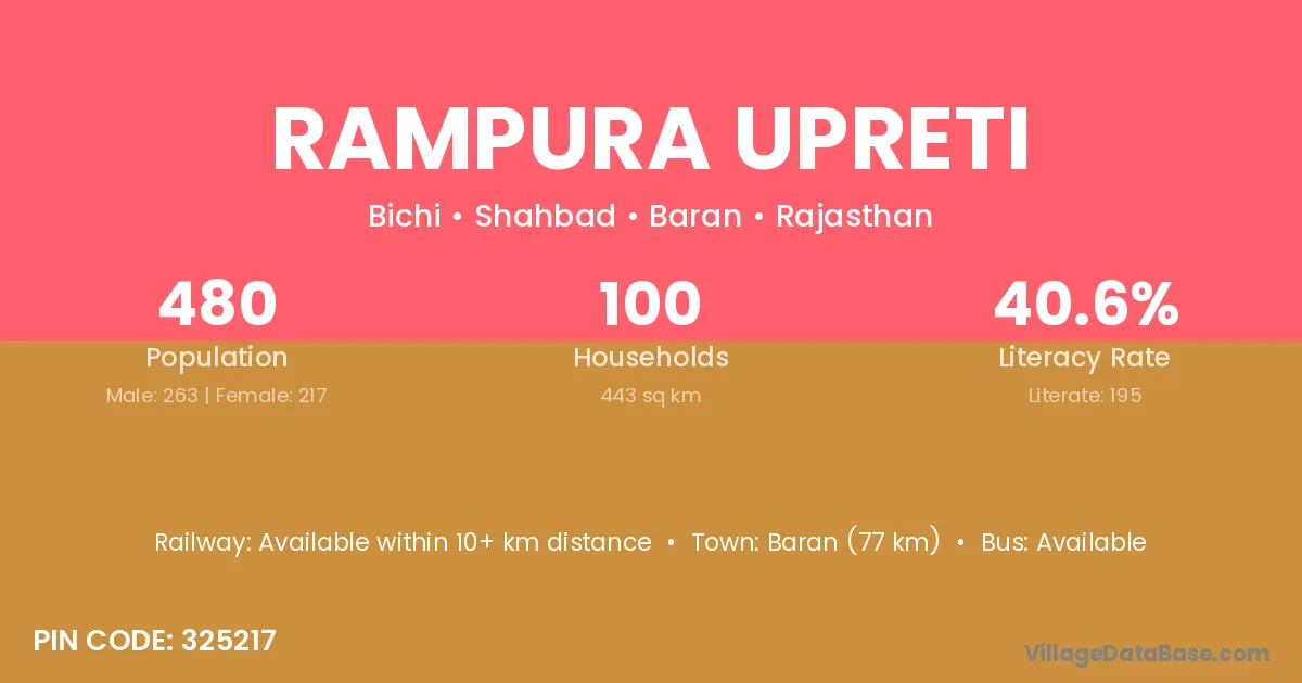 Baran (77 km) is the nearest town to Rampura Upreti village for major economic activities and is located approximately 77 km away.
