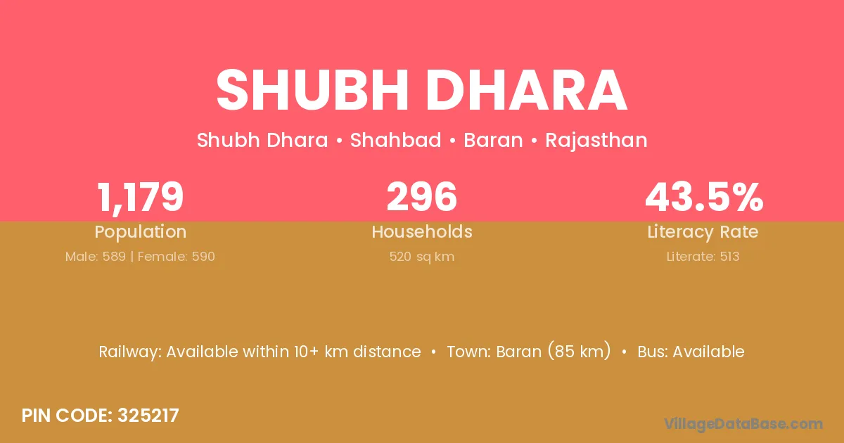 Shubh Dhara village has a total population of 1,179 people, of which 589 are males and 590 are females.