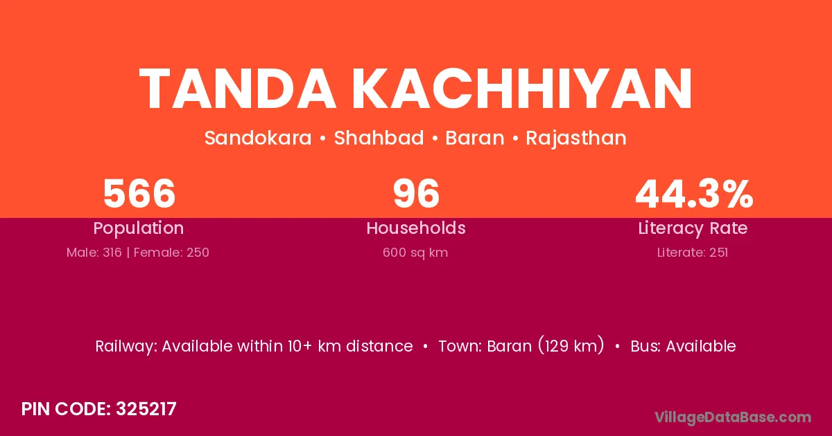 Baran (129 km) is the nearest town to Tanda Kachhiyan village for major economic activities and is located approximately 129 km away.