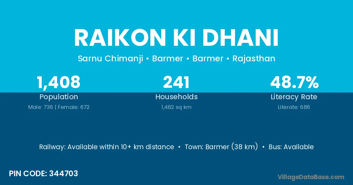 Barmer (38 km) is the nearest town to Raikon Ki Dhani village for major economic activities and is located approximately 38 km away.