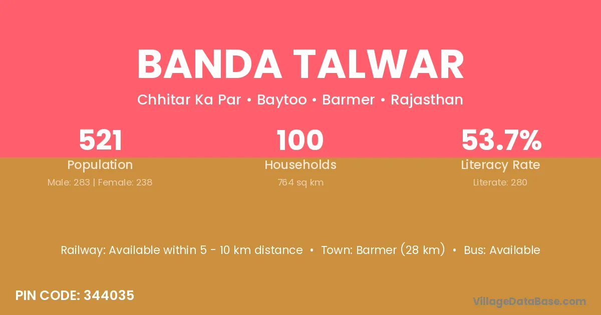Barmer (28 km) is the nearest town to Banda Talwar village for major economic activities and is located approximately 28 km away.
