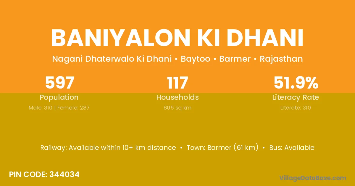 Barmer (61 km) is the nearest town to Baniyalon Ki Dhani village for major economic activities and is located approximately 61 km away.
