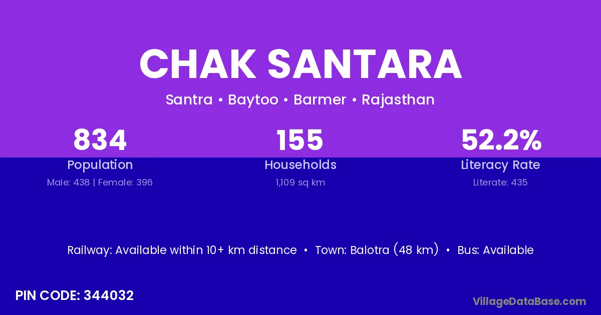 Balotra (48 km) is the nearest town to Chak Santara village for major economic activities and is located approximately 48 km away.
