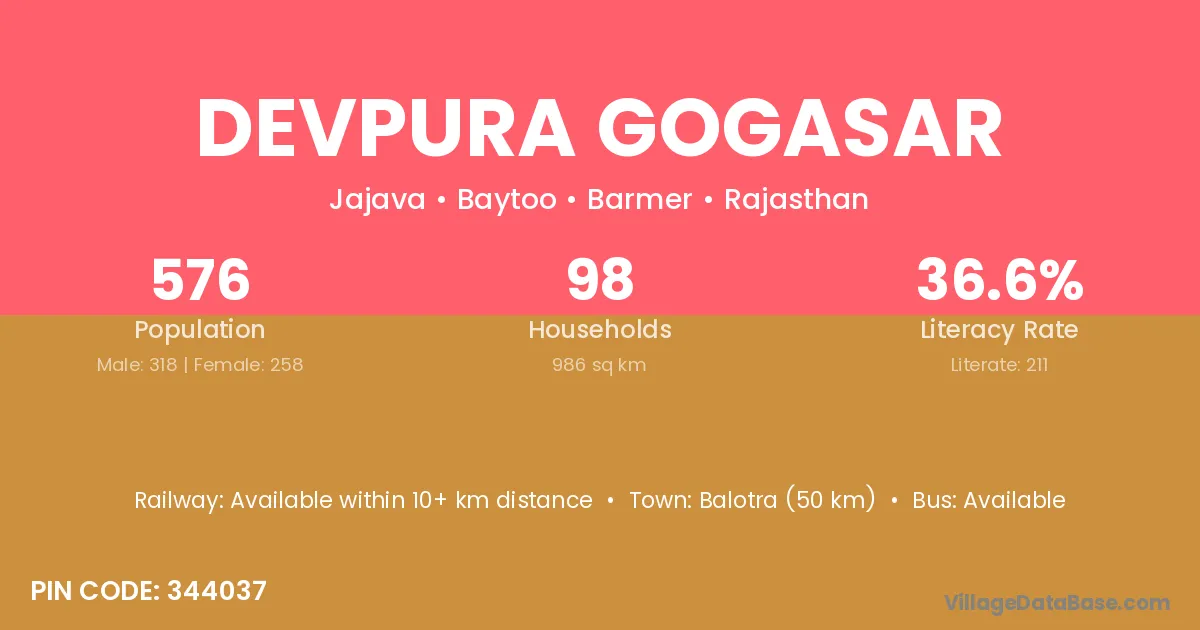 Balotra (50 km) is the nearest town to Devpura Gogasar village for major economic activities and is located approximately 50 km away.