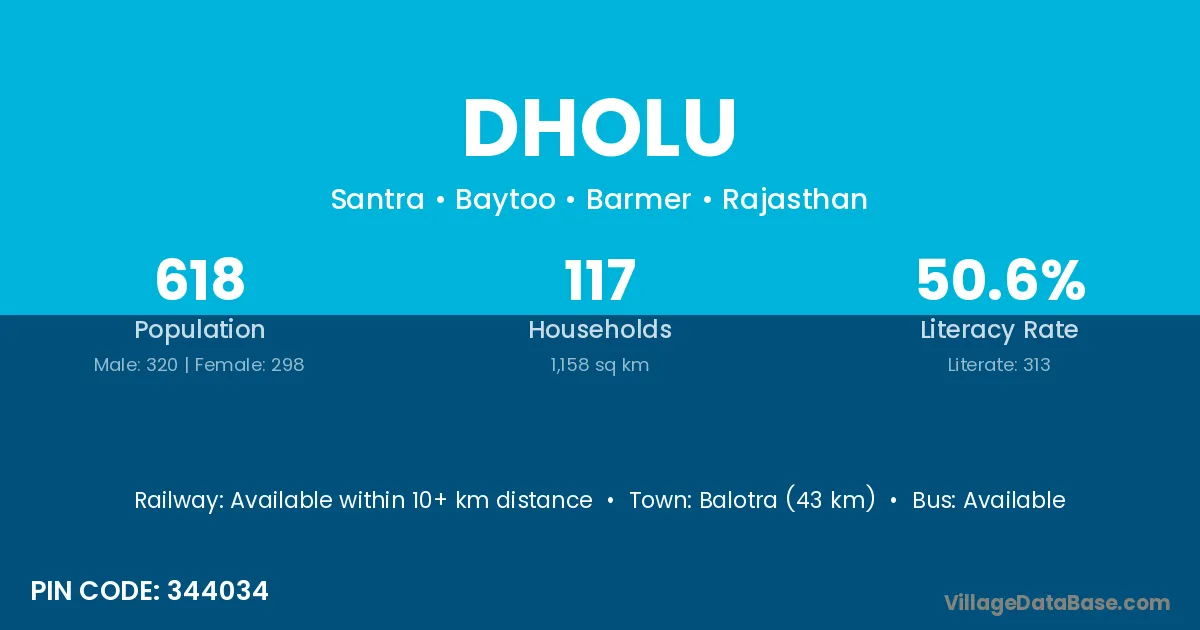 Balotra (43 km) is the nearest town to Dholu village for major economic activities and is located approximately 43 km away.