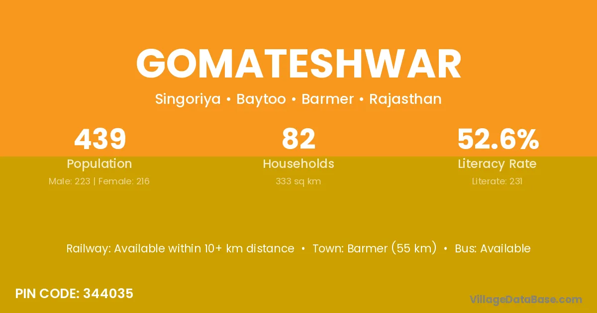 Barmer (55 km) is the nearest town to Gomateshwar village for major economic activities and is located approximately 55 km away.