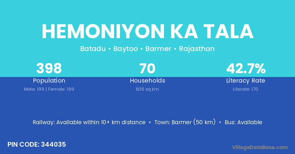 Barmer (50 km) is the nearest town to Hemoniyon Ka Tala village for major economic activities and is located approximately 50 km away.
