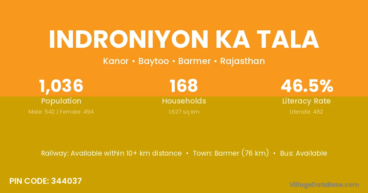 Barmer (76 km) is the nearest town to Indroniyon Ka Tala village for major economic activities and is located approximately 76 km away.