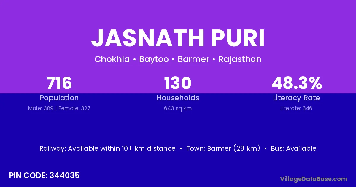Barmer (28 km) is the nearest town to Jasnath Puri village for major economic activities and is located approximately 28 km away.
