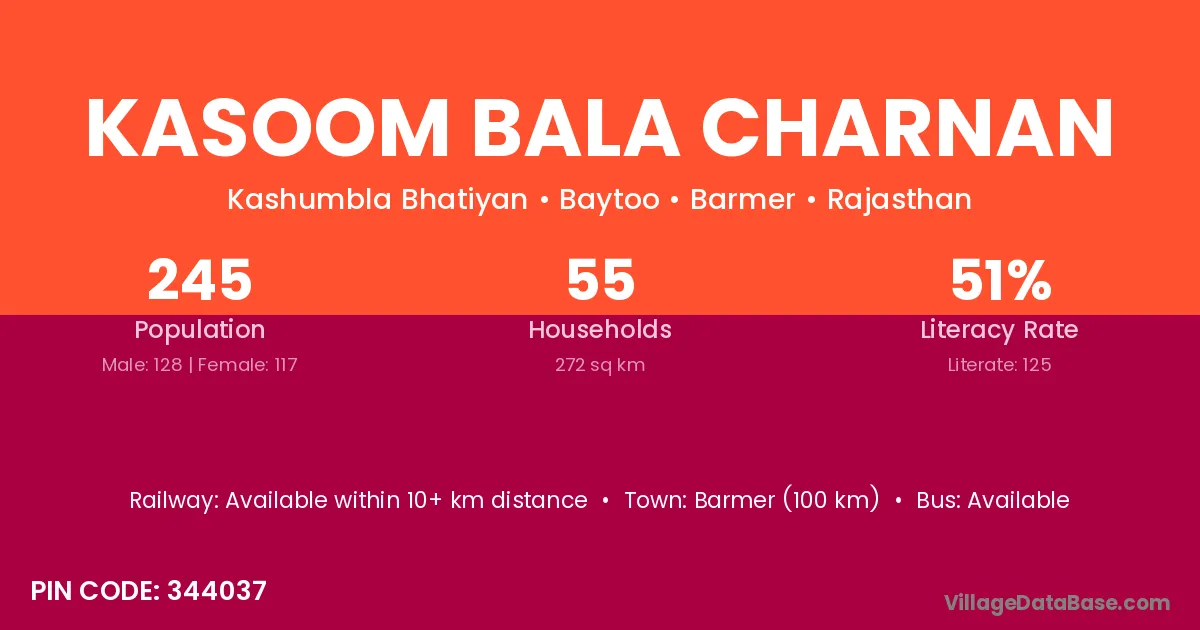 Barmer (100 km) is the nearest town to Kasoom Bala Charnan village for major economic activities and is located approximately 100 km away.