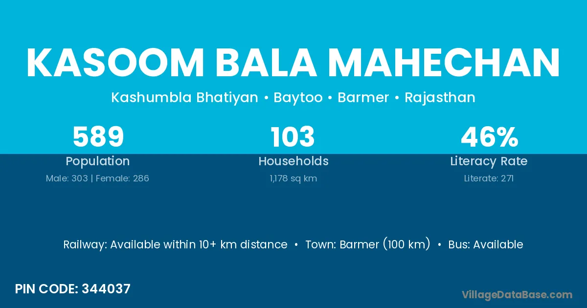 Barmer (100 km) is the nearest town to Kasoom Bala Mahechan village for major economic activities and is located approximately 100 km away.