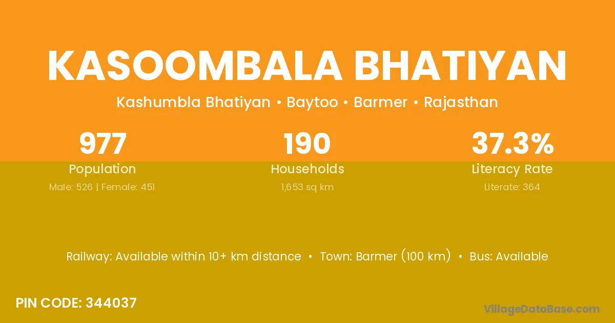 Barmer (100 km) is the nearest town to Kasoombala Bhatiyan village for major economic activities and is located approximately 100 km away.
