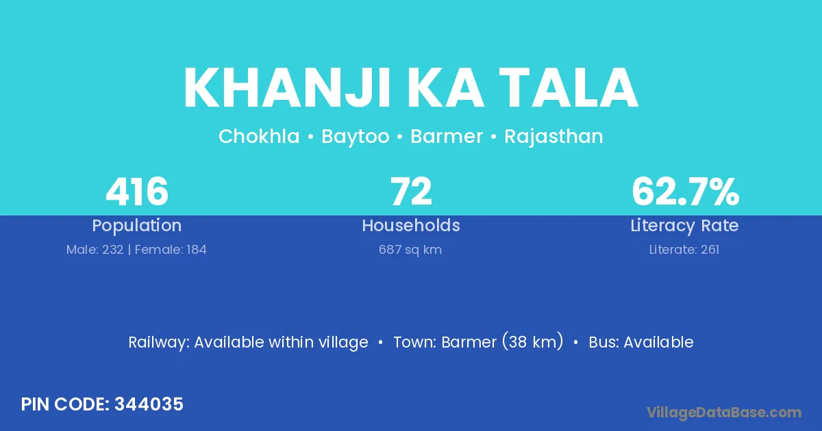 Khanji Ka Tala village has a total population of 416 people, of which 232 are males and 184 are females.