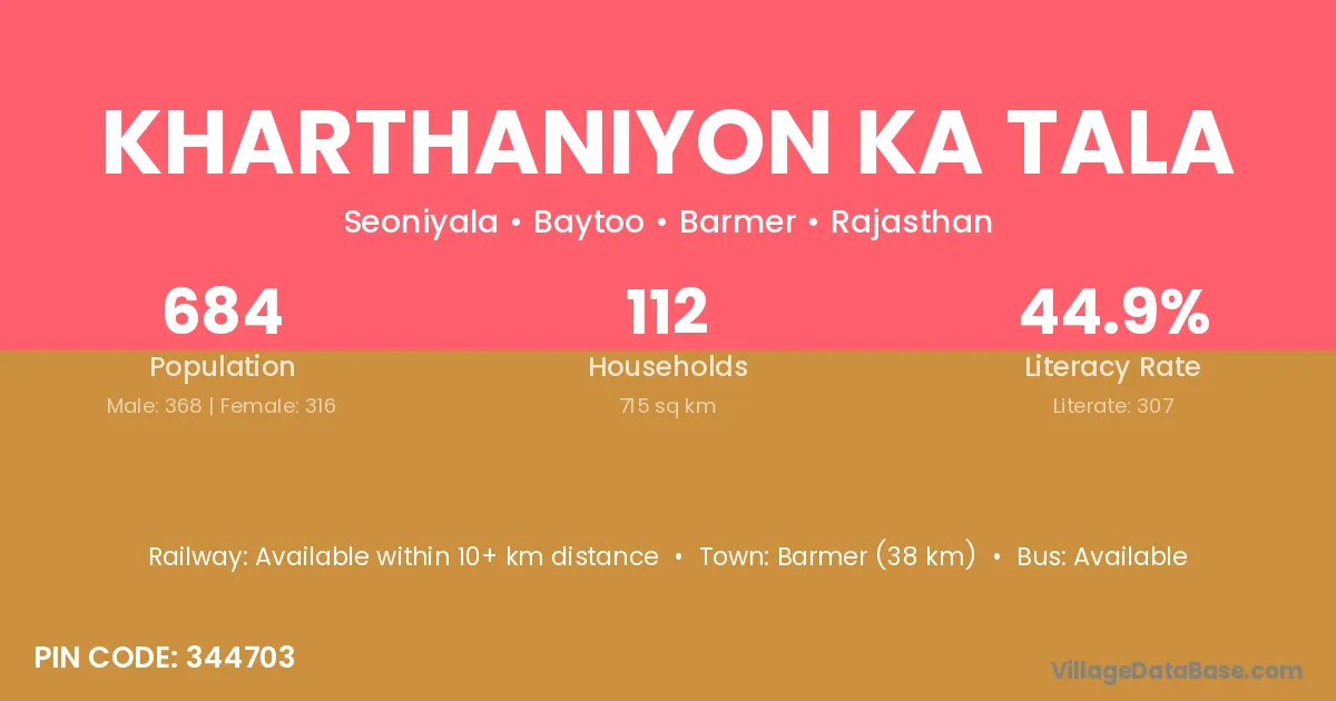 Kharthaniyon Ka Tala village has a total population of 684 people, of which 368 are males and 316 are females.