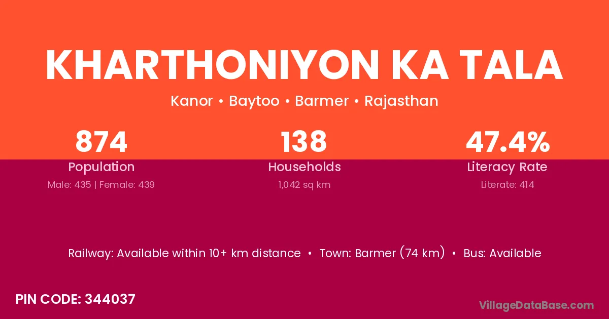 Kharthoniyon Ka Tala village has a total population of 874 people, of which 435 are males and 439 are females.
