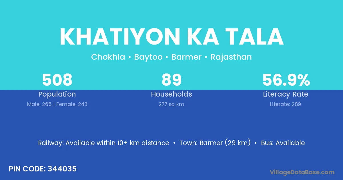 Barmer (29 km) is the nearest town to Khatiyon Ka Tala village for major economic activities and is located approximately 29 km away.