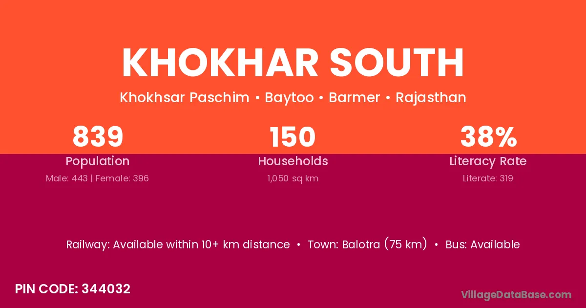 Khokhar South village has a total population of 839 people, of which 443 are males and 396 are females.