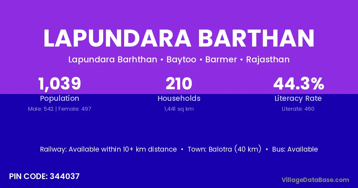 Balotra (40 km) is the nearest town to Lapundara Barthan village for major economic activities and is located approximately 40 km away.