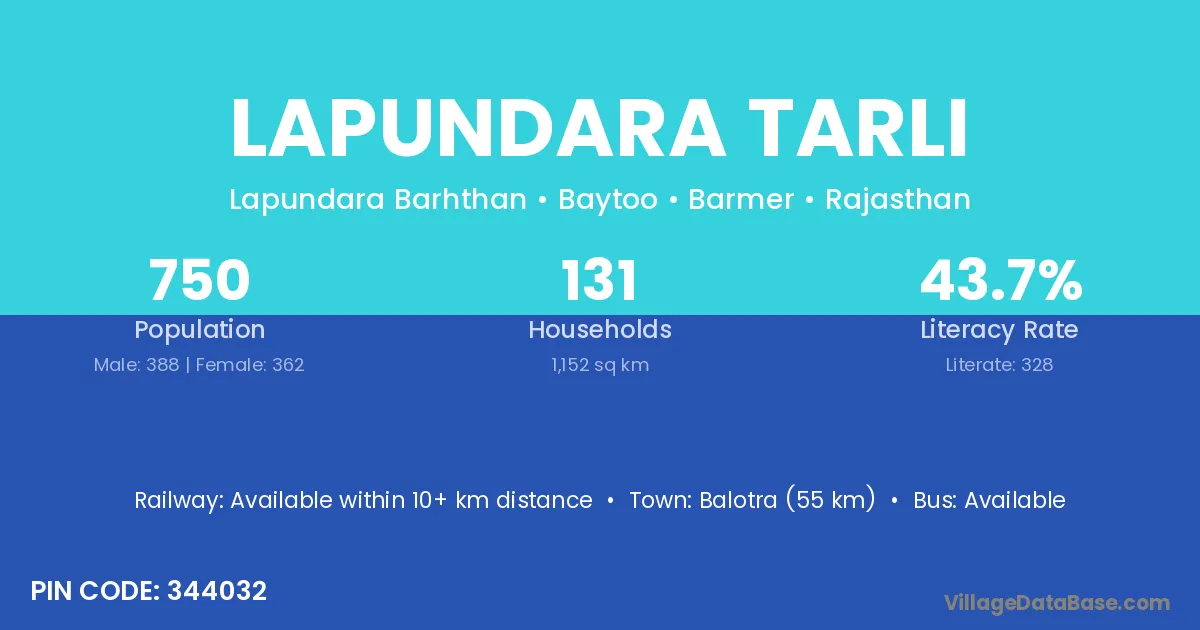 Balotra (55 km) is the nearest town to Lapundara Tarli village for major economic activities and is located approximately 55 km away.
