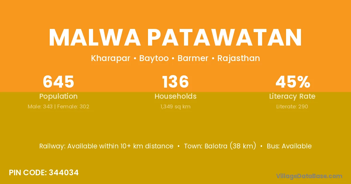 Balotra (38 km) is the nearest town to Malwa Patawatan village for major economic activities and is located approximately 38 km away.
