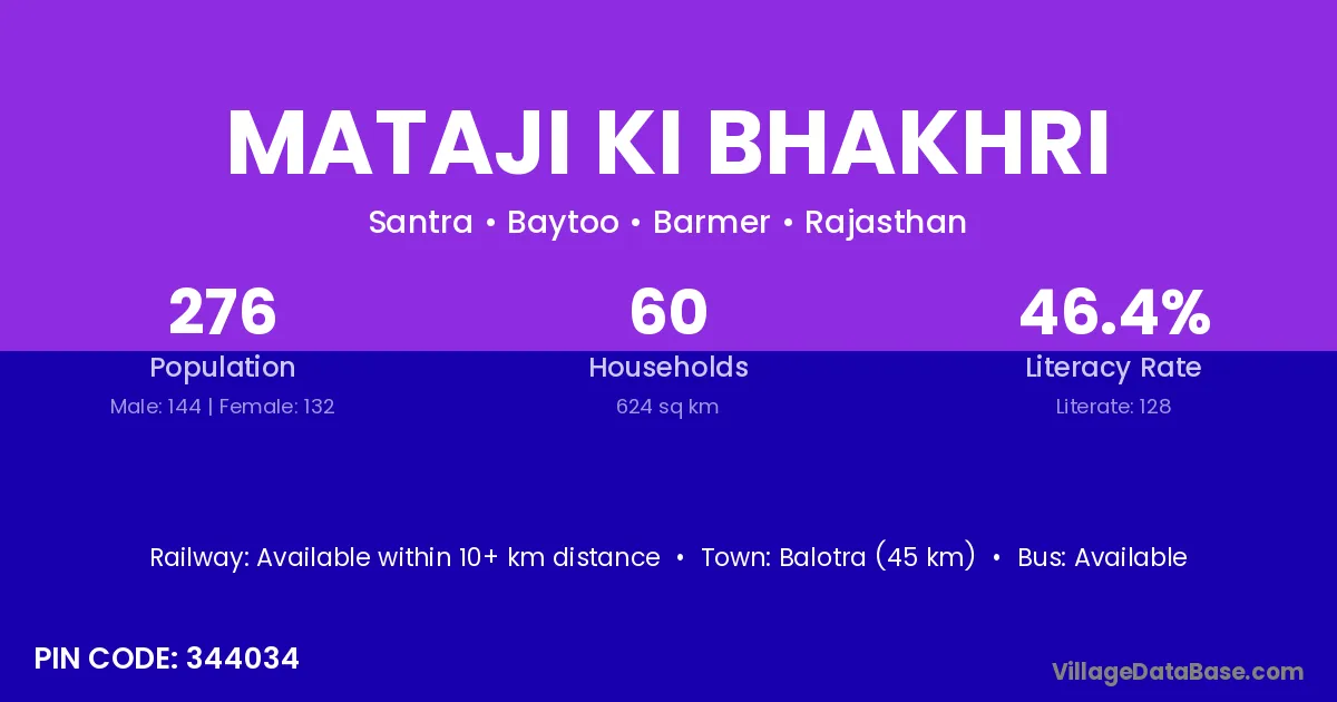 Balotra (45 km) is the nearest town to Mataji Ki Bhakhri village for major economic activities and is located approximately 45 km away.