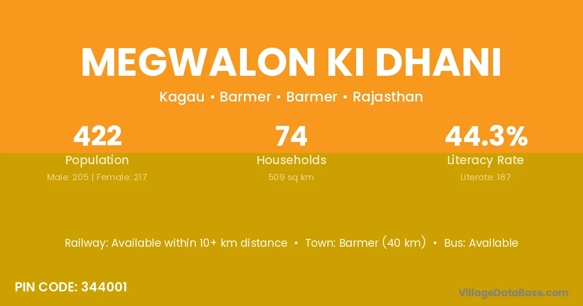 Balotra (62 km) is the nearest town to Megwalon Ki Dhani village for major economic activities and is located approximately 62 km away.