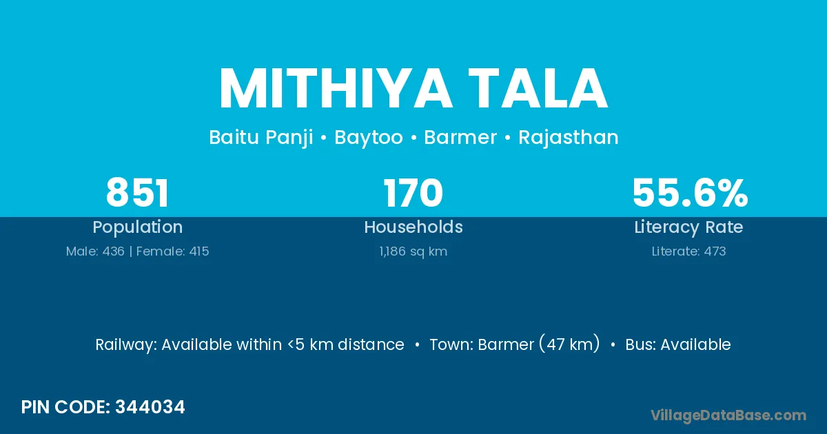Barmer (47 km) is the nearest town to Mithiya Tala village for major economic activities and is located approximately 47 km away.