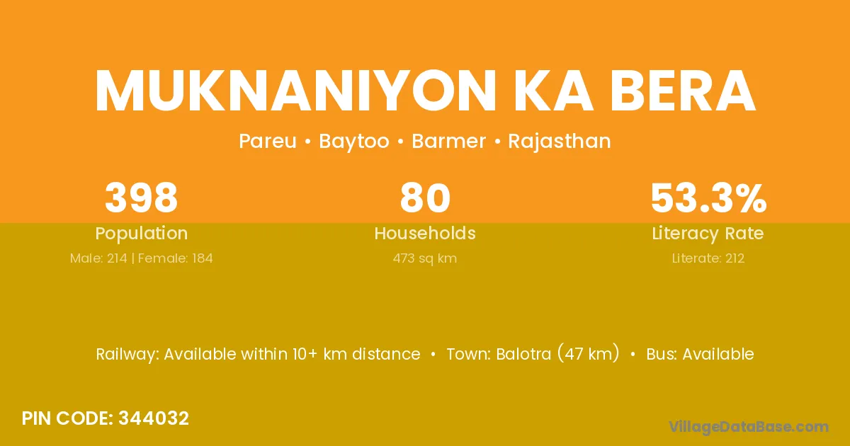 Balotra (47 km) is the nearest town to Muknaniyon Ka Bera village for major economic activities and is located approximately 47 km away.