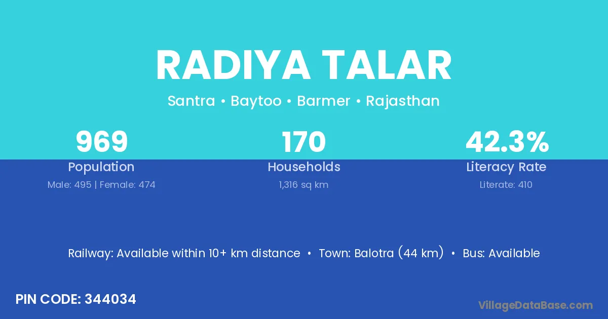 Balotra (44 km) is the nearest town to Radiya Talar village for major economic activities and is located approximately 44 km away.