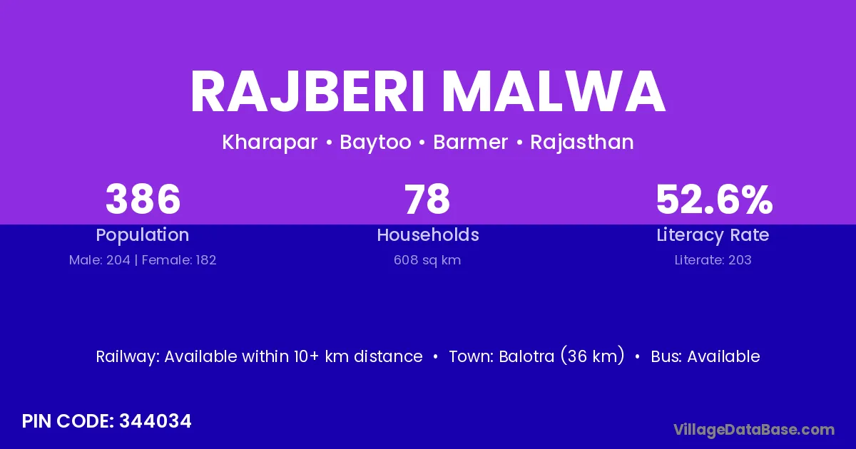 Balotra (36 km) is the nearest town to Rajberi Malwa village for major economic activities and is located approximately 36 km away.