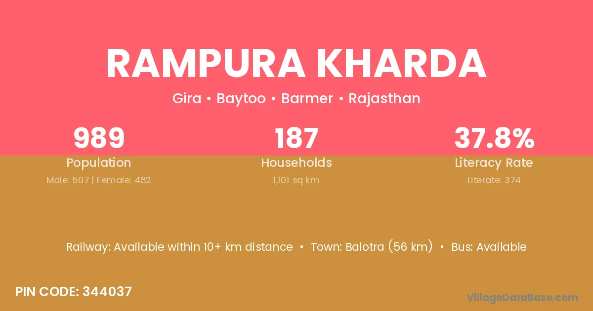 Rampura Kharda village has a total population of 989 people, of which 507 are males and 482 are females.
