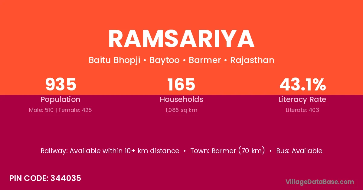 Barmer (70 km) is the nearest town to Ramsariya village for major economic activities and is located approximately 70 km away.