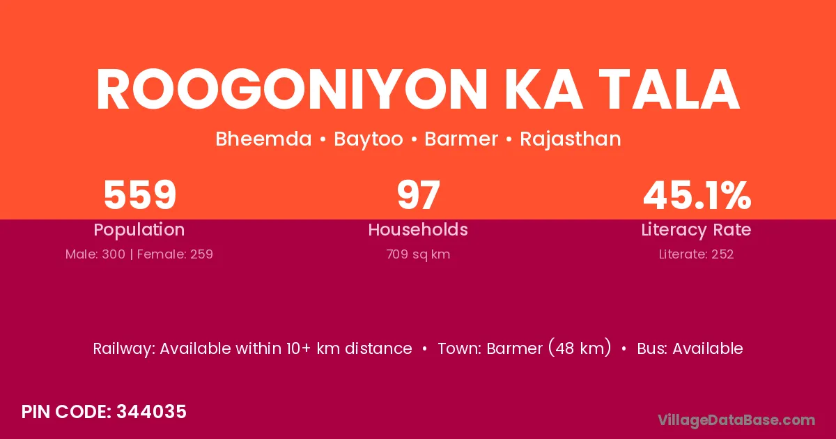 Barmer (48 km) is the nearest town to Roogoniyon Ka Tala village for major economic activities and is located approximately 48 km away.