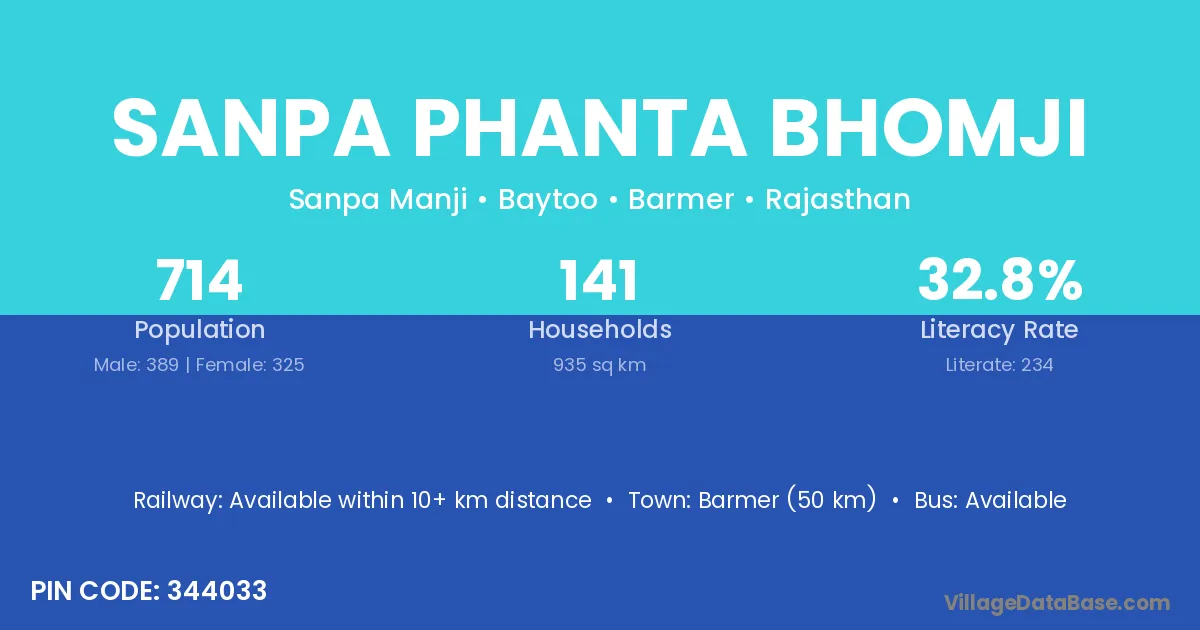 Barmer (50 km) is the nearest town to Sanpa Phanta Bhomji village for major economic activities and is located approximately 50 km away.