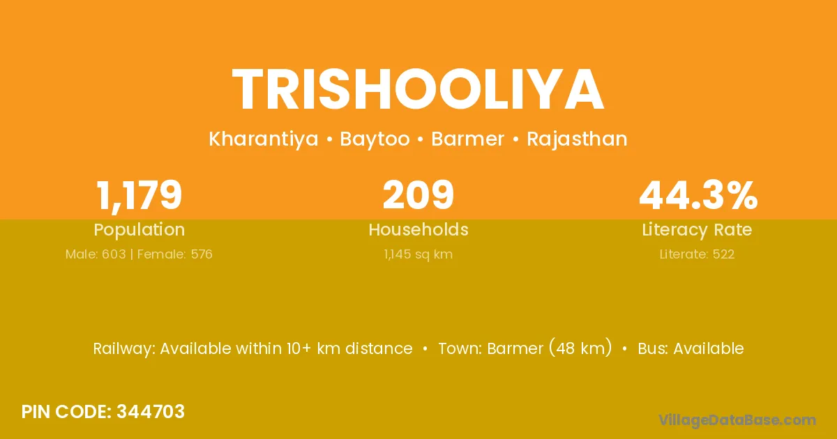 Barmer (48 km) is the nearest town to Trishooliya village for major economic activities and is located approximately 48 km away.