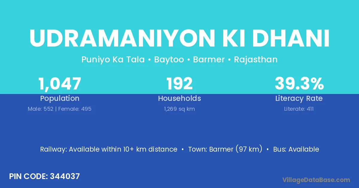 Barmer (97 km) is the nearest town to Udramaniyon Ki Dhani village for major economic activities and is located approximately 97 km away.