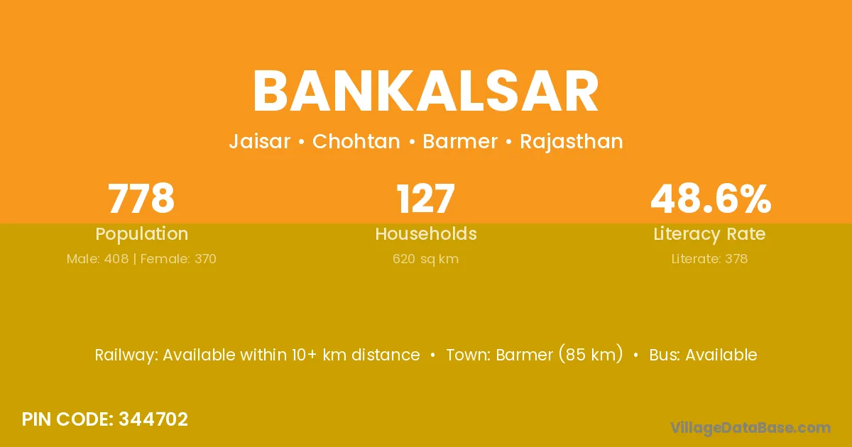 Barmer (85 km) is the nearest town to Bankalsar village for major economic activities and is located approximately 85 km away.