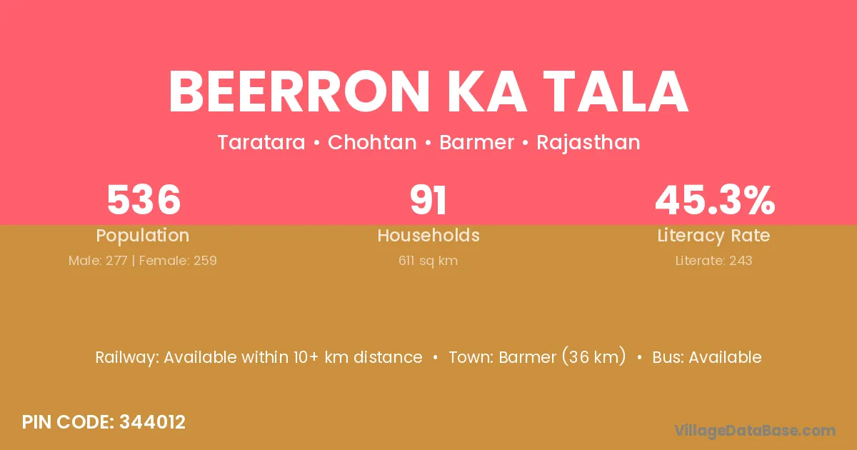 Beerron Ka Tala village has a total population of 536 people, of which 277 are males and 259 are females.