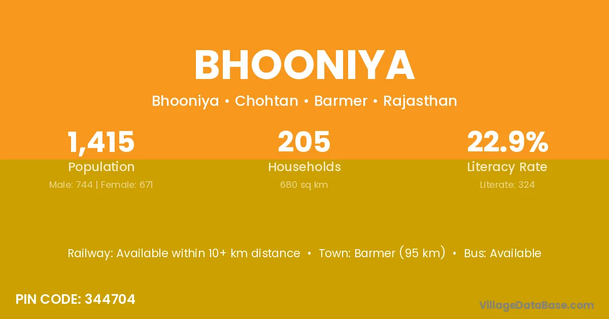 Barmer (95 km) is the nearest town to Bhooniya village for major economic activities and is located approximately 95 km away.