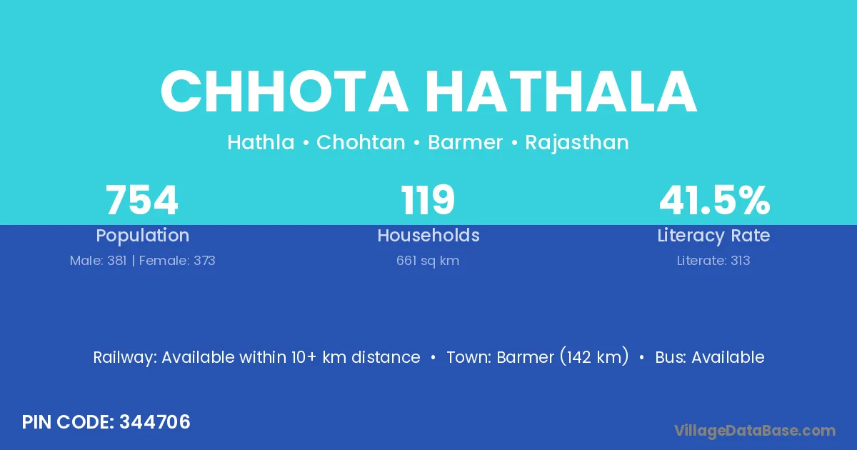Barmer (142 km) is the nearest town to Chhota Hathala village for major economic activities and is located approximately 142 km away.