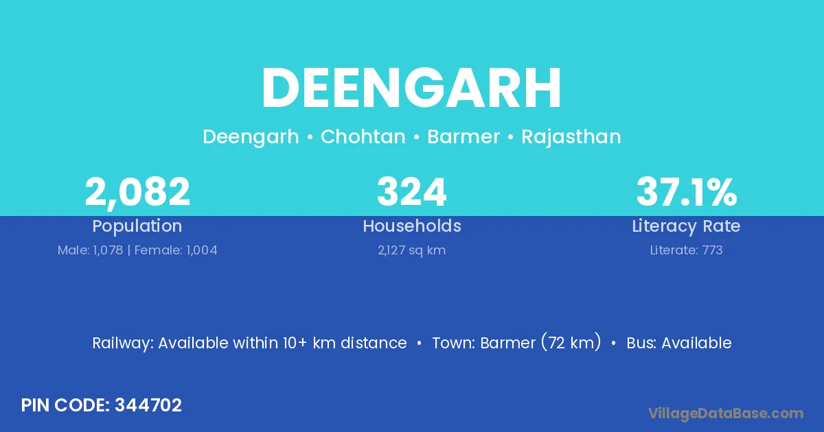 Barmer (72 km) is the nearest town to Deengarh village for major economic activities and is located approximately 72 km away.
