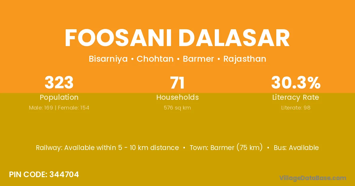 Barmer (75 km) is the nearest town to Foosani Dalasar village for major economic activities and is located approximately 75 km away.